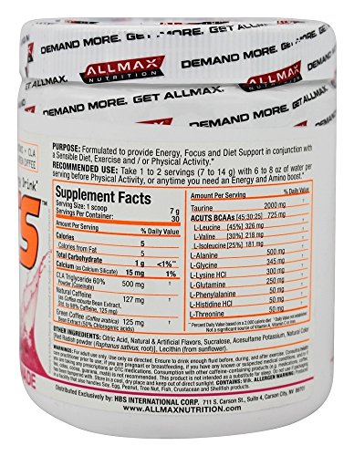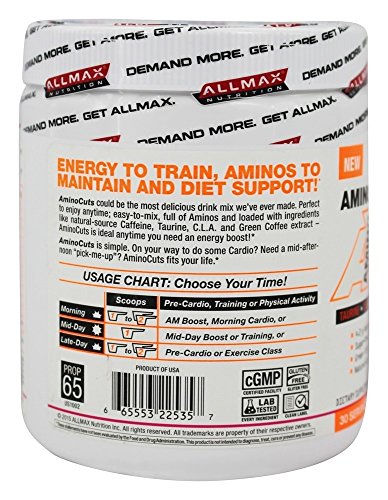 Aminos + CLA & Green Coffee Taurine · Caffeine · CLA · Green Coffee 4.2 g Amino Acids Sugar-Free & Only 5 Calories! Green Coffee Extract & C.L.A. Natural-Source Caffeine Dietary Supplement 30 Servings cGMP Certified Facility Gluten Free Lab Tested - Every Ingredient Clean LabelPurpose: Formulated to provide Energy, Focus and Diet Support in conjunction with a Sensible Diet, Exercise and / or Physical Activity.Energy To Train, Aminos To Maintain And Diet Support!AminoCuts could be the most delicious drink mix we've ever made. Perfect to enjoy anytime; easy-to-mix, full of Aminos and loaded with ingredients like natural-source Caffeine, Taurine, C.L.A. and Green Coffee extract - AminoCuts is ideal anytime you need an energy boost!AminoCuts is simple. On your way to do some Cardio? Need a mid-afternoon "pick-me-up"? AminoCuts fits your life.Feature