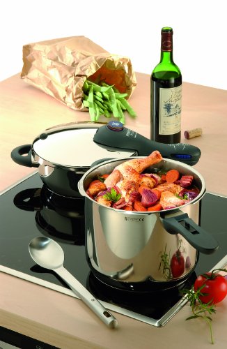 Holding 6-1/2 liters, and 3 liters, this attractive WMF Perfect Plus dual pressure cooker set will cover many of your cooking needs at once. The lid that accompanies the set will fit either cooker. Our pressure cookers will handle a variety of recipes and offer many conveniences to simplify both use and cleanup. Made of heavy-gauge 18/10 stainless steel, the main chamber offers strength and durability, while a polished exterior shine gives it an eye-catching appearance. A Trans Therm base evenly distributes heat and offers excellent high-temperature retention. The black phenolic handle is ergonomically designed for comfort and resists heating; additionally, it easily detaches to simplify cleanup. In the event that excessive pressure begins to build up, an integrated advanced safety feature system audibly indicates the need to reduce heat. Pressure cooking lessens cooking time and preserves vitamins and minerals for healthier meals. Includes recipes.Feature