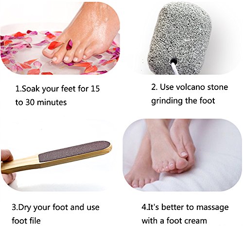 4.To use, soak callused skin in warm water until it feels soft. Then wet the foot pumice stone in soapy water and rub it gently over the callus in a circular motion. Then dry your foot,use foot file to exfoliate and smooth your feet.