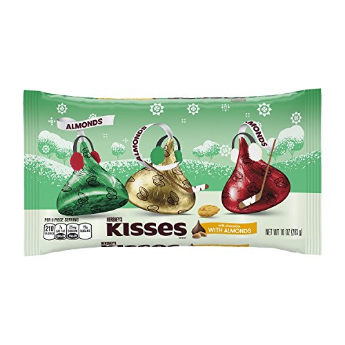 -. Title : KISSES Chocolates with Almonds, Gluten-Free Milk Chocolate Covered Almond Candy Wrapped in Red, Gold, and Green Foil in Holiday Packaging, 10 Ounce Bag (Pack of 4)
