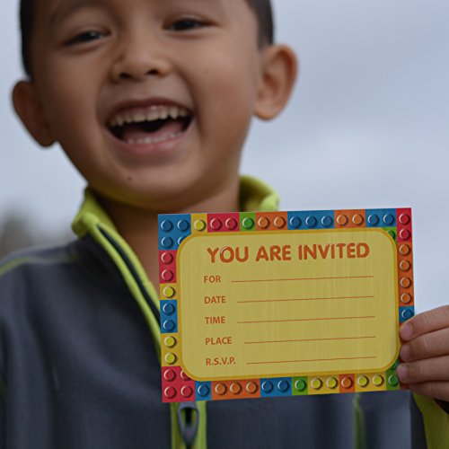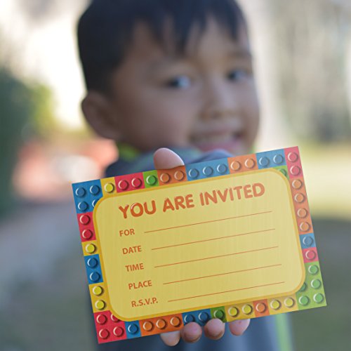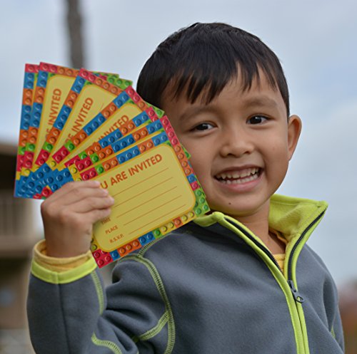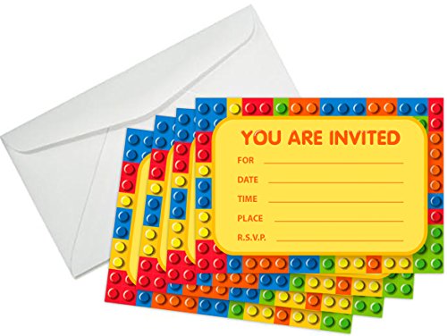 -. Title : Building Blocks Birthday Party Invitations (8 Pcs) & (8) White Paper Envelopes - The Invite Cards Every Kid Will Love! Brick Shapes Mini Figure Theme Party Pack