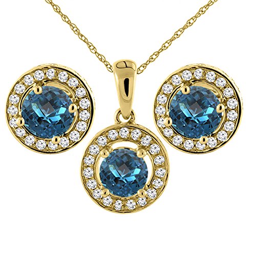 -. Binding : Jewelry -. Brand : Sabrina Silver -. Department : womens -. Feature : 14K Solid Gold / Naturally-vibrant, superior quality color gemstone / High Quality Genuine Diamond Accents / Complimentary gold chain included -. ProductGroup : Jewelry -. ProductTypeName : FASHIONOTHER -. Title : 14K Yellow Gold Natural London Blue Topaz Earrings and Pendant Set with Diamond Halo Round 5 mm