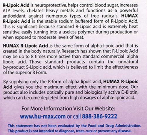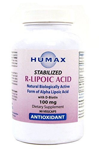90 veggies capsules of stabilized R-Lipoic Acid from Humax, one of the first major sellers of stable RLA. Product also include D-Biotin, which can become depleted with heavy use of alpha lipoic acid.Feature
