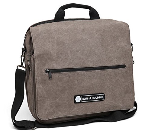 -. Binding : Sports -. Brand : ThinkGeek -. Color : Grey -. Department : unisex-adult -. EAN : 0856260002410 -. Feature : Large grey canvas messenger bag, designed and made by ThinkGeek! / Main padded laptop compartment big enough to hold a 17" laptop / Sturdy canvas, brass zippers and pop-rivet construction / * d20 badge with "Bag of Holding" proudly printed on the front flap -. IsAutographed : 0 -. IsMemorabilia : 0 -. Model : 3336851 -. MPN : 3336851 -. PackageQuantity : 1 -. PartNumber : 3336851 -. ProductGroup : Sports -. ProductTypeName : OUTDOOR_RECREATION_PRODUCT -. Size : accessories -. Title : The Bag of Holding Messenger Bag -. UPC : 856260002410