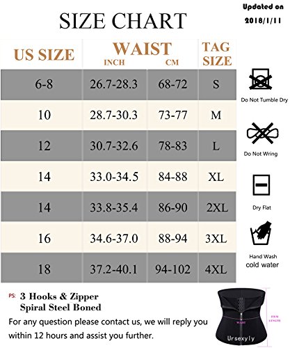 -. Feature : ♦ Bullet Point ♦ : Double adjustment high compression design to ensure this Abdominal Wrap Weight Loss Corset Shaper could fit your figure at the most extent - 3 rows of hooks & eye closures inner + zipper closure outer, and the combo hooks and zipper panel really help distribute the pressure evenly / ♦ Wearing Occasions ♦: Office, Club, Party, Wedding, Gym, Festival, Holiday. Any occasion or daily life you want to be slimmer / ♦6 Spiral Steel Boned♦ provide a nice support on your back. It will help to improve your posture especially when working on the computer for a long time. It will remind you to maintain an uP.R.Ight posture always / ♦Promotes Body Heat♦: The Sweat Enhancing Sauna Waist Trainer Corset intensifies perspiration in your core more than regular gym-clothing during exercise; Ideal for YOGA, POSTPARTUM RECOVERY, GYM, SPORTS, BODY SHAPING etc, and guarantees a correct posture during your workouts / Please you can see our product photo size chart, such as S fit for US 0-2, waist 23-25 inch. If sometimes your US size not match with our waist inch size, such as you are US 0-2, but waist size 26 inch, finally depends on your waist size such as 26 inch. Then you could choose size M