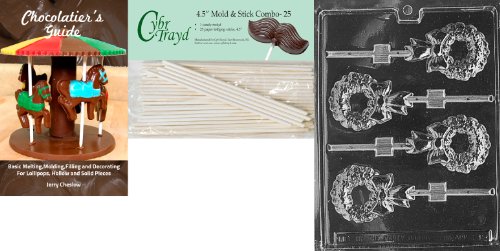 Cybrtrayd 45St25Bk-C098 'Wreath Lolly' Christmas Chocolate Candy Mold with 25 4.5-Inch Lollipop Sticks and Chocolatier's Guide
