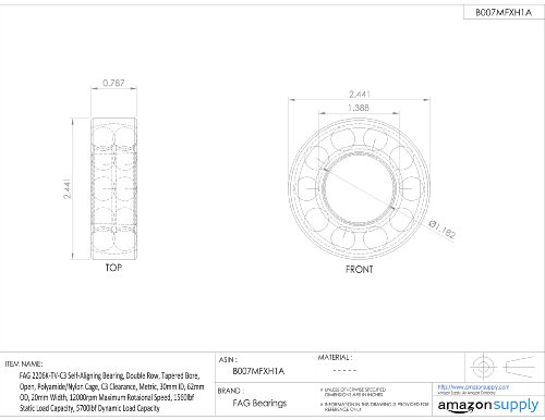 FAG 2206K-TV-C3 Self-Aligning Bearing, Double Row, Tapered Bore, Open, Polyamide/Nylon Cage, C3 Clearance, Metric, 30mm ID, 62mm OD, 20mm Width, 12000rpm Maximum Rotaional Speed, 1560lbf Static Load Capacity, 5700lbf Dynamic Load Capacity