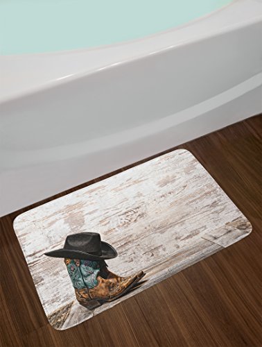Western Bath Mat by Ambesonne, Traditional Rodeo Cowboy Hat and Cowgirl Boots Retro Grunge Background Art Photo, Plush Bathroom Decor Mat with Non Slip Backing, 29.5 W X 17.5 W Inches, Brown Black