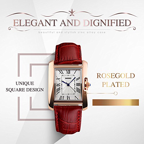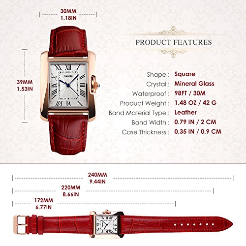 "Highlights: • Special Dial Design with Rhinestones and Three-dimensional Roman Numerals On It • Imported Japanese CITIZEN Quartz Movement provides precise and accurate time keeping • Key Scratch Resistant Watch Face • Comfortable Leather Band Strap • Stainless Steel Durable Waterproof Case Cover, Not Easy To Fade • 98FT / 30M Water Resistant - Daily Use Waterproof, Hand Wash, Rain Day, Sweating. (Please DONOT PULL OUT the button under water) • Classic Fashion Casual Dress Watch Design. Combines Quality, Leading Edge Fashion, and Value • Great and Romantic Gift for Your Friends Features • Key Scratch Resistant Watch Face • 98FT / 30M Waterproof • Leather Band Strap Material: • Case Material: Stainless Steel • Band Material: Leather • Mirror Surface: Mineral Glass (Key Scratch Resistant) Specification: • Dial Case Diameter: 1.18 Inch / 3 CM • Dial Case Thickness: 0.35 Inch / 0.9 CM • Band Color: Red • Band Width: 0.79 Inch / 2 CM • Band Length: 9.45 Inch / 24 CM • Max Fit Wrist: 8.66 inch / 22 cm • Min Fit Wrist: 6.77 inch / 17.2 cm • Band Clasp Type: Double Locking Fold Over Clasp • Watch Weight: 1.48 oz / 42 g **NOTE**: • Please DONOT PULL OUT the Button Underwater. Use in extreme Hot or Cold temperature will damage the leather band and shorter watch life. • If mist or droplets found inside watch surface, please contact manufacturer immediately. • Clean the strap by a soft cloth on regular bases is highly recommended. • Too much water contact will damage the leather band and shorter watch life. What Is In The Package: • Women Leather Band Watch x 1"Feature