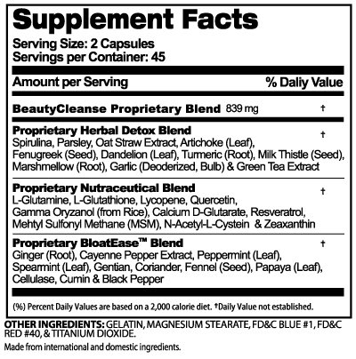 -. Binding : Health and Beauty -. Brand : BeautyFit -. EAN : 0858695002041 -. Feature : Supports Natural Detoxification / Gentle, Non-Laxative Formula / Formulated For Everyday Use -. IsAdultProduct : 0 -. Label : Beauty Fit -. LegalDisclaimer : Pregnant or lactating women should consult a doctor before using any product. Discontinue use and consult your doctor if any adverse reactions occur. Artichoke is contraindicated in blockage of the bile ducts, acute gallbladder inflammation and intestinal blockage. Persons with gallstones should consult a practitioner prior to use. Gentian is contraindicated in gastric and duodenal ulcers, and when gastric irritation and inflammation are present. NOT INTENDED FOR USE BY PERSONS UNDER THE AGE OF -. Manufacturer : Beauty Fit -. Model : 7250018 -. MPN : BF2041 -. NumberOfItems : 1 -. PackageQuantity : 1 -. PartNumber : BF2041 -. ProductGroup : Health and Beauty -. ProductTypeName : HEALTH_PERSONAL_CARE -. PublicationDate : 2014-04-08 -. Publisher : Beauty Fit -. ReleaseDate : 2015-06-22 -. Size : 90 -. Studio : Beauty Fit -. Title : BeautyFit BeautyCleanse, Natural Daily Detoxification For Women, 90 capsules -. UPC : 858695002041