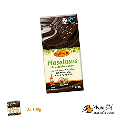 -. Feature : Birkengoldschokolade mit Xylit in der Geschmacksrichtung Zartbitter mit Haselnüssen / 55 % Kakaoanteil / Fairtrade- Qualität / vegan / ausschließlich mit Xylit gesüßt