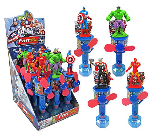 Studio : Frankford Candy Publisher : Frankford Candy Binding : Grocery Product Description Marvel Avengers Assemble Fan with Candy 12ct by Frankford Candy Each contains 0.35 oz. of candy with push button fan. Includes: Ironman, Hulk, Captain America, Thor Each box contains 12 fans. 0