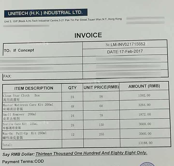 现有质疑此护理套装为假货,也有因收货后逼迫优惠不达的差评,特此申明:确实是系正品,UNITERS公司出口,有INVOICE发票为证,此产品主要是为赠送我店真皮沙发买家,销售金额很小,没有必要作假,国内也少有销售,没有假货货源(淘宝只有海外代购和悠云有售)。如果得不到亲们的信任和支持,我们售完即止,不再上架。被差评所逼,列出发票(唉,利润没有,反成为差评要挟的工具,也许下一步,UNITECH就会叫我们下架了)