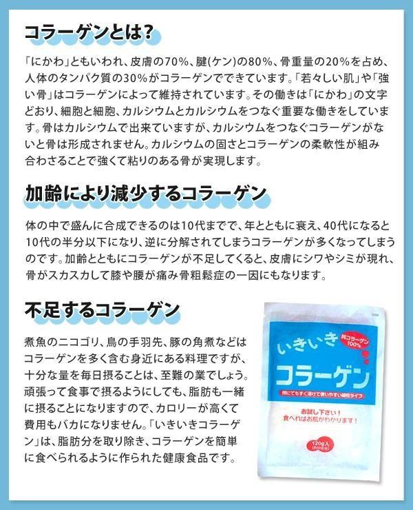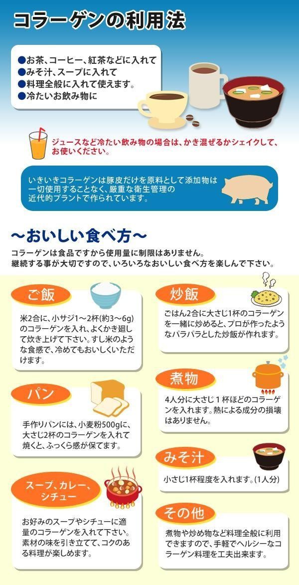 | コラーゲンは体内で最も多いたんぱく質で、皮膚の70%を占めています。加齢とともに減少するため、意識的に摂取する必要があります。「いきいきコラーゲン」に配合されているコラーゲンは、健康な豚の皮を使用し、厳重な衛生管理の近代的プラントで作られています。何にでもサッと混ざって味も変わらないので、幅広い用途でお使い頂けます。 |