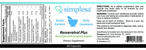 Simplesa Resveratrol Synergy is designed to work in harmony with the Bioflavonoids complex and Quercetin Dihydrate. Combining resveratrol with complementary molecules related to resveratrol amplify and extend the health effects of resveratrol. Other anti-aging compounds may work synergistically with resveratrol to help extend the longevity of cells by mimicking a calorie-restrictive diet. At Simplesa, you get only the highest quality science-based nutritional supplements in the simplest forms possible. You can trust that the products you receive are pure, potent and optimized for absorption. Following an all-inclusive approach, our products offer the necessary ingredients for optimal nutritional support. Ingredients are meticulously sourced and scientifically formulated for your total satisfaction.Feature