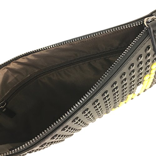 -. Feature : Slim clutch crafted in synthetic leather. / Studded front in a angry monster eye motif. / Removable wristlet strap. / Zip top closure. Lined. Interior zip & slip pocket. / 8" H x 11"W Imported