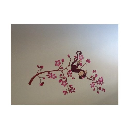 - Feature : Features a hanging monkey and pink flowers / Ideal for nursery, kids room, living room, or bedroom / Easy to apply, remove, reposition, and reuse without leaving damage or residue / Soft PVC film features a matte surface that can be applied on slightly textured wall surfaces / Approximately assembled size varies based on placement; Sticker sheet size is 20" x 28"