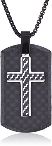 Men's Stainless Steel and Forged Carbon Fiber Dog Tag with Black Ip on 24" Box Chain Pendant Necklace