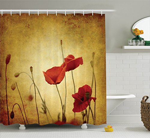 Poppy Decor Shower Curtain Set By Ambesonne, Poppies And Flower Buds On Ambient Dark Grunge Background With Retro Effects Bohemian, Bathroom Accessories, 69W X 70L Inches, Mustard Vermilion