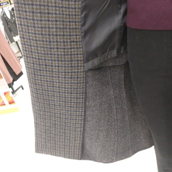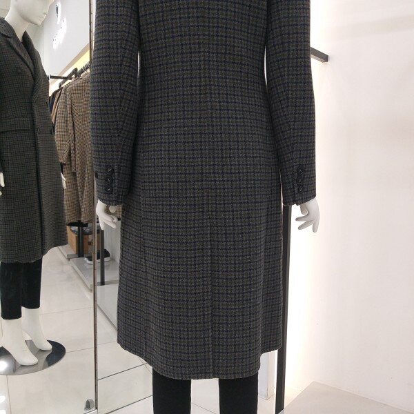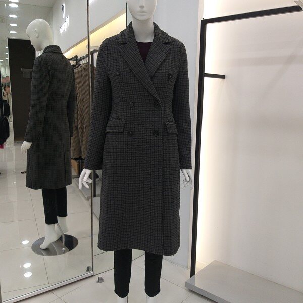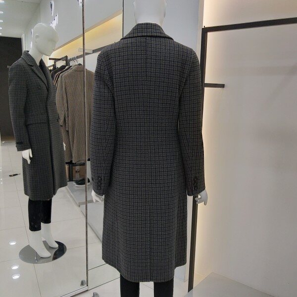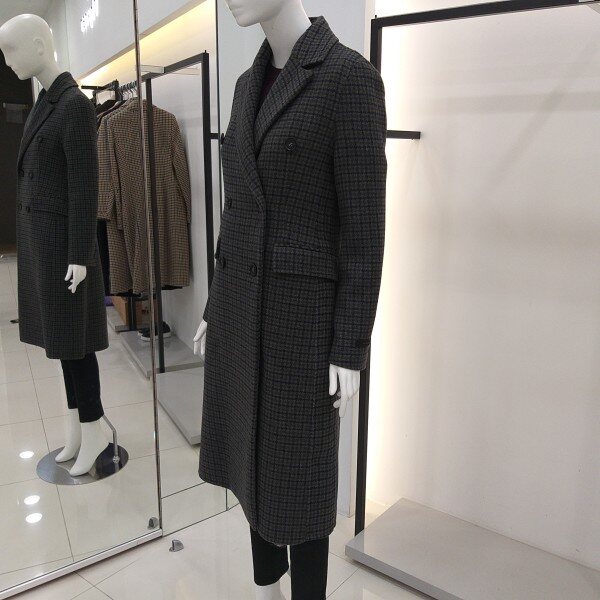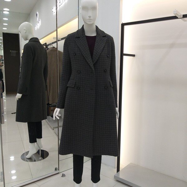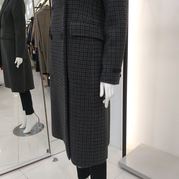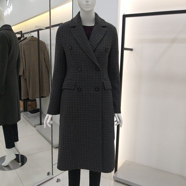 티렌 두게감도 적당히 두꺼운 카키 그레이빛 더블체크 코트입니다 롱길이이며슬림하게 떨어지는핏감이 이뻐요