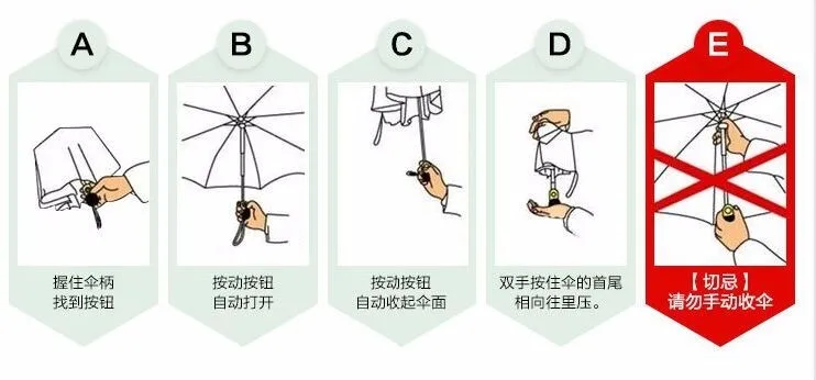 Please note how the automatic umbrella is operated:?Press the button, the umbrella open automatically, Press the button again will automatically shut. Please don't shut up the umbrella manually