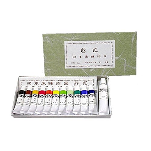 -. Feature : 色名:黒、代赭(茶)、黄土、洋紅、朱、黄、若葉、白緑、緑青、群青、藍 各5mL 胡粉15mL / 初心者用として最適の絵の具です。少量のにかわが入っています。