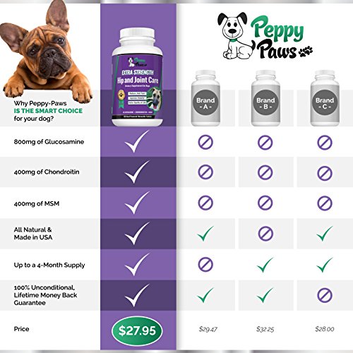 While some glucosamine / chondroitin / MSM products contain minimal amounts of the active ingredients, we've cut no corners. In fact, our extra strength hip and joint supplement for dogs boast as much as 4x the amount of Glucosamine as other dog vitamins for hip and joint pain, as well as more Chondroitin and MSM. Peppy Paws is the smart dog pain reliever choice.