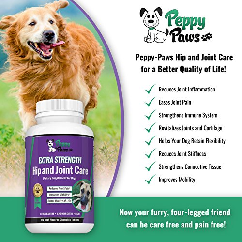It's heartbreaking when your dog is in pain and unable to move and play like he once did. But you can give him a helping hand - with Peppy Paws supplements for dogs joints. Delivered in chewable, beef-flavored tablets, this dog arthritis pain formula is fortified with Glucosamine, Chondroitin, & MSM, natural ingredients thought to work together to: