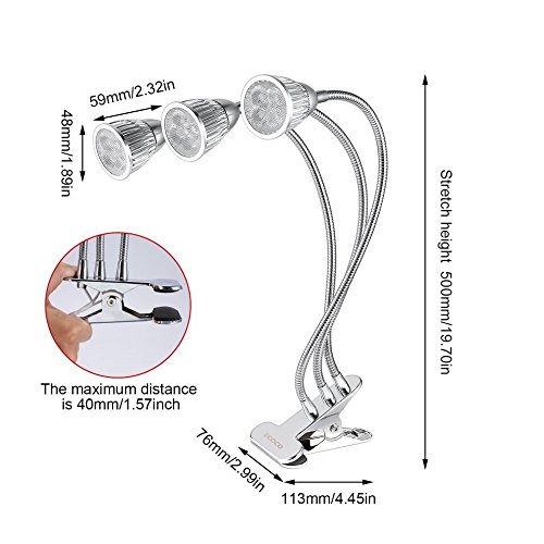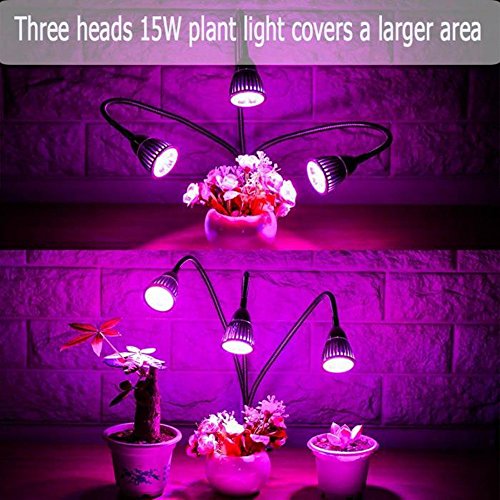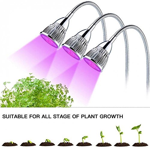 -. Feature : UNIQUE DESIGN - Improved the head of the lamp,triple head cover a larger area and take no more space; Triple switches reach a switch independently controls a lamp head, make it adjustable and flexible. you needn't to plug in/out the socket frequently. / ENERGY SAVING - This led grow light has low power consumption,high luminous efficiency and long service life(more than 30000 hours). The aluminum material shell has good heat dissipation ,It does not generate any noticeable heat even 17hrs a day, keeping your temperatures down perfectly. / ADJUSTABLE,FLEXIBLE,GOOSENECK ARM: With the 360 degree adjustable gooseneck and sturdy clip padded with exquisite foams, it is easy to install the lamp to anyplace you like.Moreover,the clip is made of metal instead of plastic, which make it more steady than general grow light. / HELP PLANTS GROW: BLUE LIGHT influences the formation of chlorophyll, enabling the plant to intake more energy. Plants that receive plenty of blue light grow with strong, healthy stems and leaves. RED LIGHT contributes to the optimal development. It's essential to a plant's early life for seed germination, root growth, and bulb development. / SUITABLE FOR MOST PLANTS-Perfect plant light for indoor plants,succulent plants,flowering plants, foliage plants, potted plants, promoting leaves, flowers blooming and fruits. Extra light when raining, snowing, dark indoor. This led grow lights is suitable for balconies, greenhouses, darkroom, office and more.