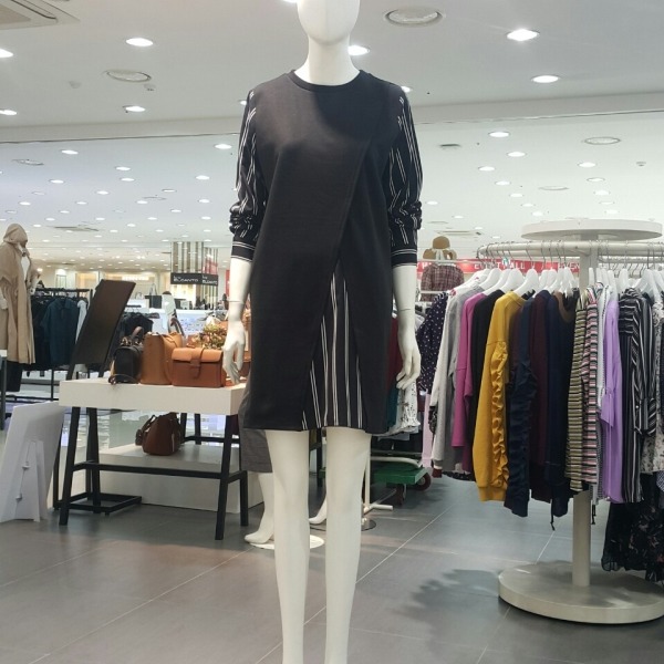 기본라운드형에 소매 시폰 스트라이프 배색이 포인트되는 원피스입니다