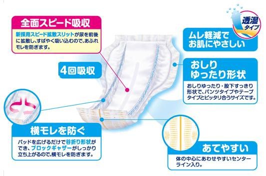 | 素材・材質 | 表面材:ポリオレフィン不織布 吸水材:綿状パルプ/吸水紙/高分子吸収材 防水材:ポリエチレンフィルム 止着材:剥離紙/スチレン系エラストマー 伸縮材:ポリウレタン糸 結合材:スチレン系エラストマー |