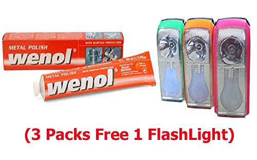 -. Feature : Use it to polish brass, copper, blank aluminum, diamond plate, silver, pewter and more / Wenol Red contains no abrasives so it wont scratch the metal as it cleans / Wenol Red leaves a clear coating of protection on treated metal that resists water, rust, and tarnishing for weeks / Wenol has been awarded Manufacturer of the Year from the prestigious International Show Car Association, Pacific Division / 3 Pack 50 ml each tube FREE 1 FLASHLIGHT