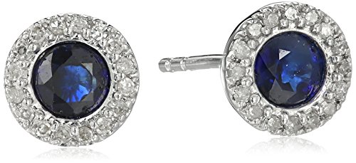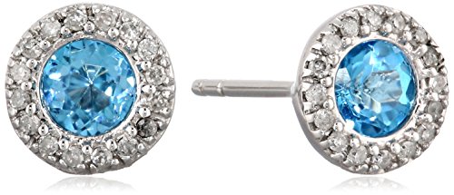 Round stud earring in 10k white gold with gemstone centerpiece framed in small prong-set diamonds