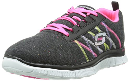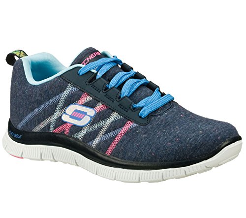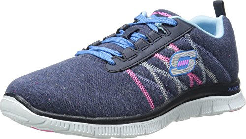 Fun sporty style and heaven-sent comfort combine in the SKECHERS Flex Appeal - Miracle Worker shoe. Soft heathered fabric upper in a lace up athletic sporty training sneaker with stitching accents, flexible sole and Memory Foam insole. Padded collar and tongue. Soft fabric shoe lining. Memory Foam cushioned comfort insole. Color accented topsole trim. Flex Appeal lightweight shock absorbing super flexible midsole. Flexible traction outsole. 1 inch built in heel. Weight: 6 1/2 oz. per shoe in a women's size 7.