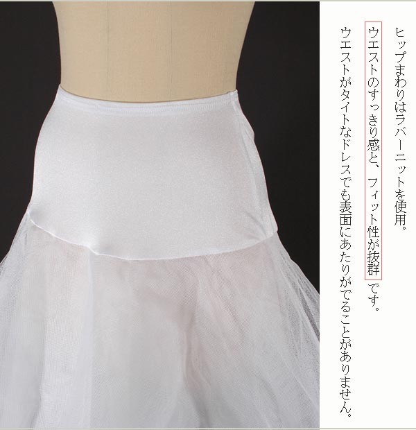 丈:100cm ドレスよりもパニエ丈が5cmほど短いのが理想です。(裾からパニエがチラチラ覗かないために) パニエ丈が長い場合はラヴァーニットとチュールの接ぎ目を適当に摘み、糸で留めておくと短くなります。