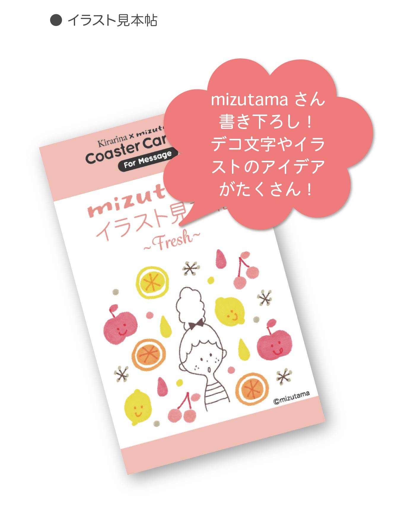 The body of Kirarina twin is a set with sample book with six illustrations of set limited mizutama design, six coasters (with 4 patterns, with 2 blanks), plus how to draw illustrations.