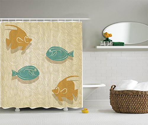 Fish And Waves Shower Curtain Set By Ambesonne, Aquarium Marine Ocean Themed Fishing Decor, Bathroom Accessories, 69W X 70L Inches