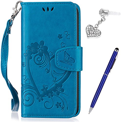 Galaxy S7 Edge Case,Galaxy S7 Edge Cover,ikasus Embossing Love Butterfly Flower Flip Folio Wallet Case PU Leather Scratch Resistant Stand Card Slots Case +Touch Pen Dust Plug for Galaxy S7 Edge,Blue