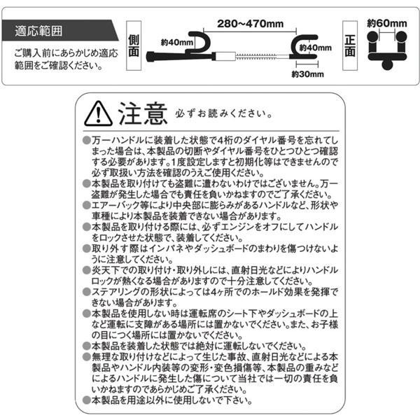 | 破壊工作に強い設計で愛車を盗難からしっかり守ります!ダイヤルキー式なので、キーの紛失や不正な複製の心配がありません。内装を傷つけにくい材質で車にも優しく、ハンドルロックを装着することで外から防犯対策車ということが視認できるので、盗難抑止効果も期待できます。(ご購入前に予め適応範囲をご確認ください。) |