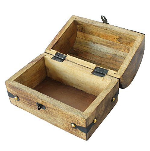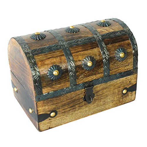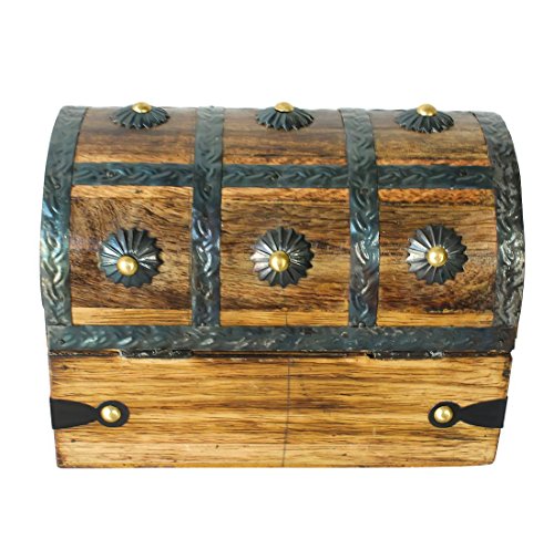 Looks like an authentic Pirate Treasure Box in mini form! Made of quality wood, and has decorative iron plating and buttons. Wood finish color may vary slightly from piece to piece