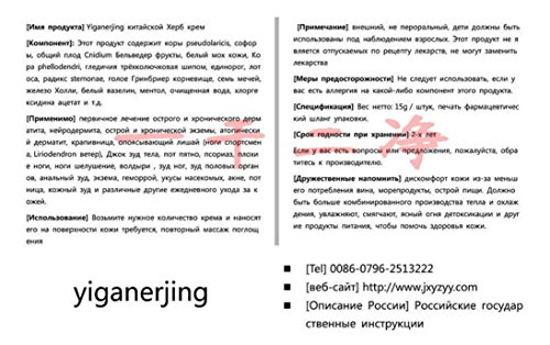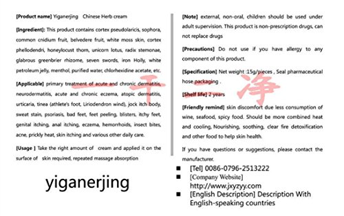 -. Feature : External use, the right amount of this product to put on the skin to wash affected area, 2 to 3 times a day, can be used again one to two weeks after symp disappear, to prevent recurrence / Taboo: allergy to any component of this disabled. / Shelf life: two years / Patients should eat less all kinds of wine, seafood, spicy food. / Package Included:1pc YiGanErJing Natural Herbal Herbal Cream for Psoriasis Eczema Acne