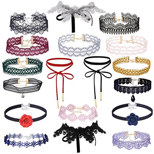 Tpocean 18Pcs Gothic Tatto Black Colorful Lace Red Flower Velvet Double Layer Lace-up Bowknot Choker Necklace with Long Pendant Set for Women Teen Girls