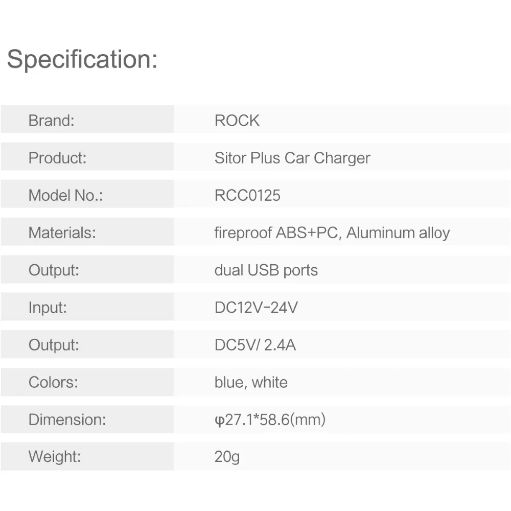 Model Number:ROCK Sitor Dual USB Car Charger