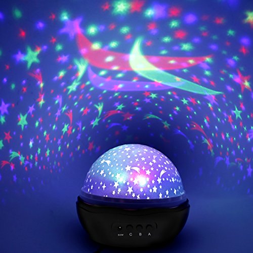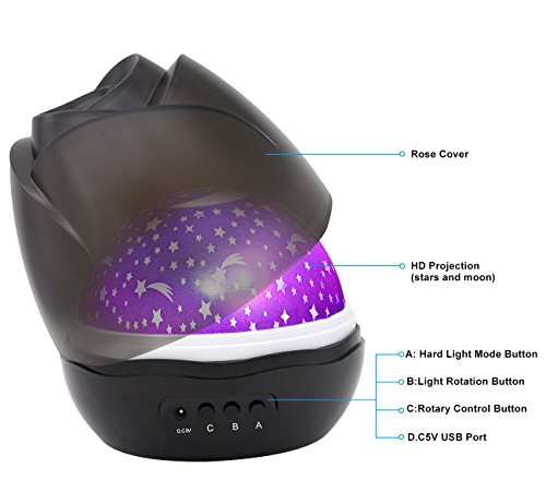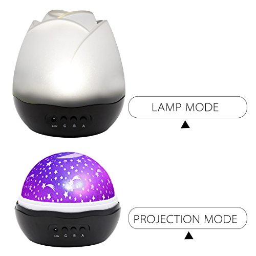 - 3 MODEL LIGHTS --- A MODE:The Nightlight light (warm light), Press A again would shut off A lamp model; B MODE:Switch for the light color (monochrome Blue, Red and Green light or colorful light overlay) ,PS:Press B Button 9 times in a row,The model B would shut off; C MODE: control the rotary switch , Press C again would shut off the rotation.