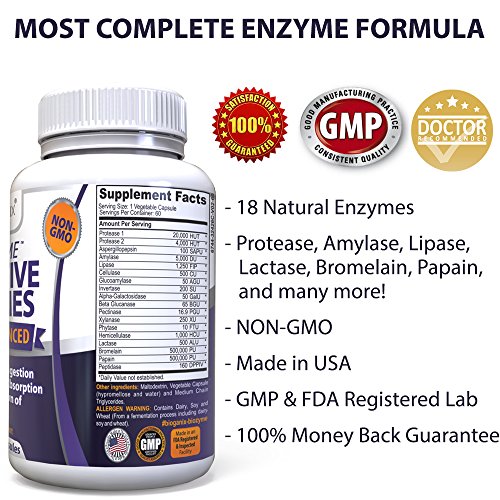 -. Feature : ULTRA ADVANCED, MOST COMPLETE 18-ENZYME NON-GMO FORMULA - Where most of the competition's formula has just a few Enzymes, BioZyme essential daily pills have all 18, including Protease, Amylase, Lipase, Pectinasse, Lactace, Bromelain, Peptidase and more - all non-GMO! / ENJOY SUPER IMPROVED DIGESTION & GET MAXIMUM RELIEF - Finally enjoy the foods you love! BioZyme reduces stomach bloating, belching, gas, heartburn, diarrhea, undigested food in the stools, intestinal cramps, abdominal pain, nausea, & fatigue that result from poor digestion, acid reflux, Irritable Bowel Syndrome (IBS), constipation, leaky gut, and dietary (food) intolerances & aids people with no gallbladder. / BOOSTS ENERGY, MOOD & OPTIMIZES NUTRIENT UPTAKE: Our natural multi Enzyme digestive health formula, enhances nutrient absorption which results in more energy, mental clarity and vitality. / GREAT FOR HIGH-PROTEIN, FAT AND CARB DIETS - These are notorious for being hard on the digestive tract, digestive enzymes are the best way to fight the nasty stomach problems they come along with. BioZyme contains super papaya (papain) enzymes, proteolytic, lipase, protease and pectinase enzymes that excel at breaking down stubborn proteins, fats and carbs and quickly relieving symp / WHY IS BIOGANIX DIGESTIVE ENZYMES THE BEST? - Our Daily Essential Enzyme formula has 18 enzymes, is non-GMO, and is made right here in the USA, in GMP Certified and FDA Registered Facilities to the highest standards. All our products are also 3rd Party Lab verified. (Ask us for the Certificates). We are so proud of the gold quality of our products - we offer a 100% Money Back Guarantee! If you dont feel the benefits, just contact us!