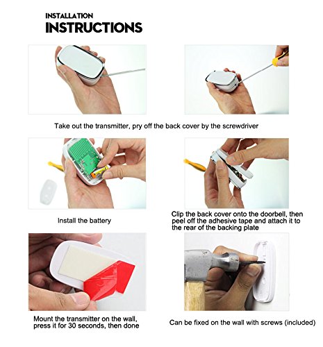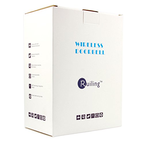 -. Feature : RuiLing Smart Wireless Remote Doorbell Set,1 transmitter button triggers (rings) and 1 chime units (receiver). The Chime units can each be configured to ring with different melodies/ringtones. / 36 different ring tones. Operating range of over 1000 feet (280m) in open area. 4 levels of adjustable volume from 0db to 85db. IP44 weatherproof (Remote transmitter button, acceptable for outdoor use). / A stylish modern design in classic white! Artful with simplicity, elegant and unique. / Easily plug receiver into an electrical outlet ( No Batteries Required for Receiver). CE, FCC, RoHS certified. / Package Includes : 1x chime units and 1x remote transmitter button, 1x double sided sticker, 2x anchors and screws, 1x screw tool, and 1x 12V 23A battery for remote transmitter.