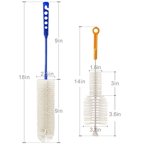- INNOVATIVE 18’’ LONG & WIDE BOTTLE BRUSH WASHER: 18" extra long brush + 2.5" diameter easily washes the inside of beer, wine, kombucha, carafes, decanter, stainless, Swell, Nalgene and other brewing or wide bottles.9" brush head cleaning head with long handle to wash bottles in one go. Flexible and long for hard to reach places.