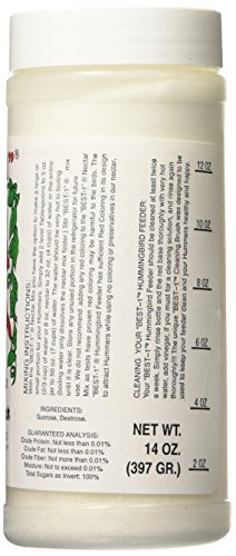 -. Brand : Best-1 -. Feature : All Natural Pure High Energy Food / Free Standing / Includes measuring guide on label with complete mixing instructions / No Colors or Preservatives / Made in the USA -. Label : Wildlife Accessories -. Manufacturer : Wildlife Accessories -. ProductGroup : Lawn & Patio -. ProductTypeName : OUTDOOR_LIVING -. Publisher : Wildlife Accessories -. Studio : Wildlife Accessories -. Title : Hummingbird Instant Nectar "Best 1" High Energy Food - Wildlife Accessories 14 oz