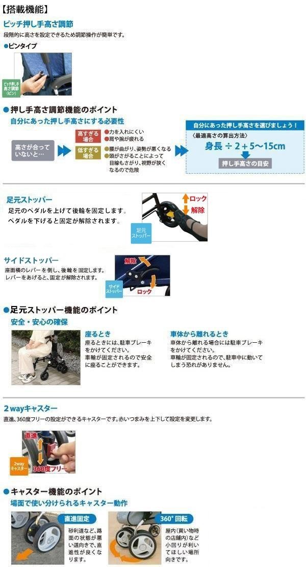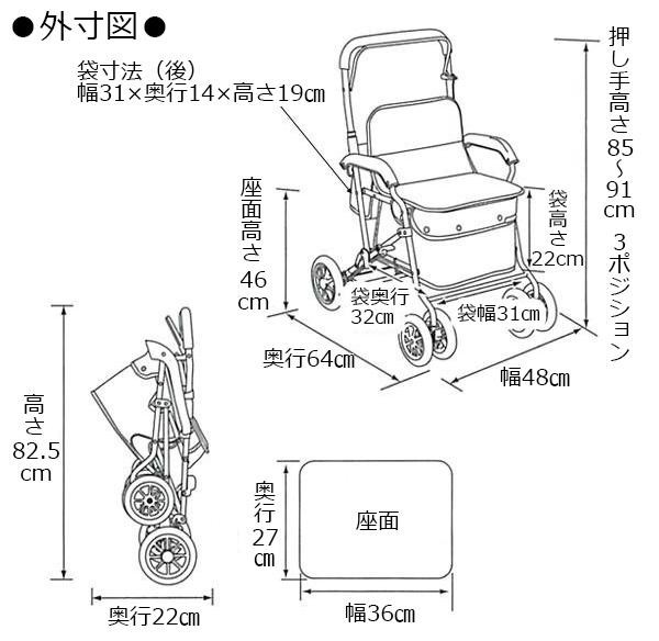 座面下の大容量収納、キャスター式の前輪と大きな後輪による安定性、長時間座っていても疲れにくい幅広座面が特徴のスタンダードタイプのシルバーカーです。毎日のお買い物や、お出かけの時に最適です。 |