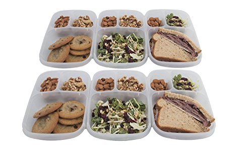 EASY PREPARATIONS • Portion Perfect bento lunch box is BPA free and Microwave, Dishwasher, Freezer safe for convenience. The container size measures 9.4" x 6.1" x 2.1" Compartment capacities: Large section-2.5 cups. Smaller Section-3/4 cup. Smallest section-1/4 cup